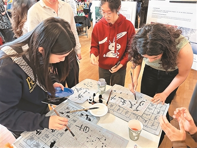 中国驻旧金山总领馆教育处为此次活动提供了精美展板和代表中国文化的礼品等。有关故宫、长城、布达拉宫等宏伟建筑的精美图文介绍,让不少游客驻足欣赏。在全场数十个展位中,中国展位熙熙攘攘,比赛踢毽子、临毛笔字帖、体验茶艺品茗、包香囊……游客们饶有兴趣,络绎不绝。“筷子夹弹珠”项目很受欢迎,许多人纷纷挽起袖子跃跃欲试,现场充满欢乐氛围。各国学生们在多姿多彩的交流互动中,感受了中国优秀传统文化的独特魅力。