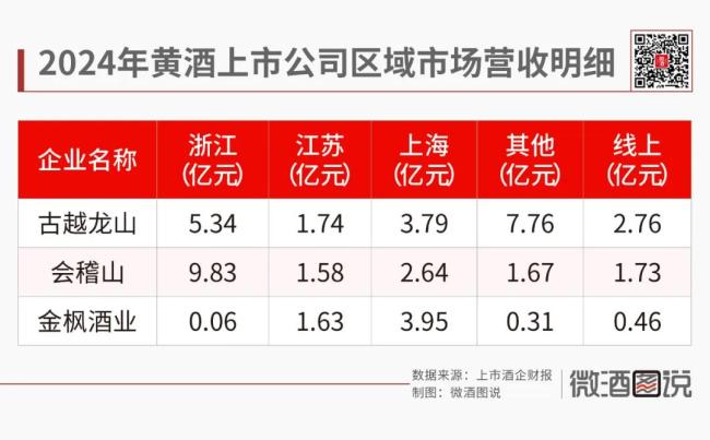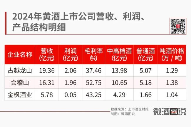 2024年年报显示,古越龙山、会稽山、金枫酒业分别实现营收19.36亿元、16.31亿元、5.78亿元,净利润分别为2.06亿元、1.96亿元、0.05亿元。