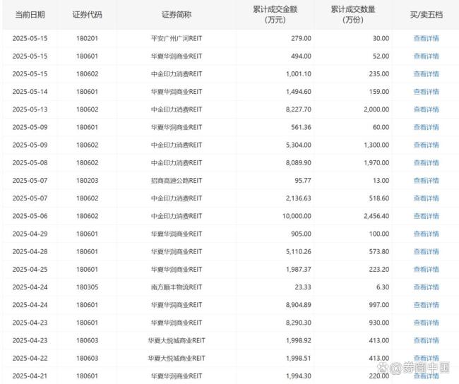 成交火爆 消费类REITs频繁“登榜” 大宗交易活跃!5月15日盘后,沪深交易所披露多只REITs完成大宗交易,其中不乏千万元乃至亿元的成交规模。近期涨幅领先的消费类REITs频繁出现大宗交易,显示出机构对这一板块更为活跃的交易。