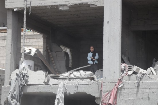 5月17日,在加沙地带北部杰巴利耶难民营,一名女子站在破损的房屋中。新华社发(阿卜杜勒拉赫曼·萨拉马 摄)