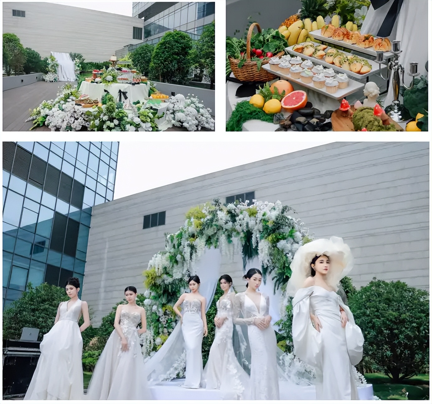 婚礼秀现场环节丰富,精彩纷呈。酒店商务总监李润凯先生亲临现场并致辞,分享了酒店在打造独特婚宴体验上的优势与理念。天源创意创始人徐媛女士随后登台,深入解读了当下婚礼设计的潮流趋势。唯美的婚纱走秀环节成为焦点,多款经典与创新设计的婚纱礼服在葱郁绿意的映衬下璀璨生辉,完美演绎了不同风格新娘的魅力瞬间。穿插其中的幸运抽奖环节点燃了现场气氛,为幸运来宾送上了丰厚的婚礼相关好礼。
