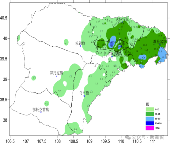 内蒙古暴雨红警:两地雨量超100毫米 局地强对流天气持续。7月9日20时,鄂尔多斯市气象台发布降雨实况信息。当天8时至20时,该市东部地区出现小到中雨,局地有大到暴雨,并伴有雷暴大风和短时强降水等强对流天气。最大降雨量和最大小时雨强均出现在东胜罕台镇九城宫(秦直道),分别为100.0毫米和80.1毫米。具体各旗区政府所在地降雨量如下:东胜区25.2毫米,准格尔旗薛家湾镇23.0毫米,达拉特旗树林召镇10.8毫米,康巴什区2.2毫米,伊金霍洛旗阿勒腾席热镇0.2毫米。
