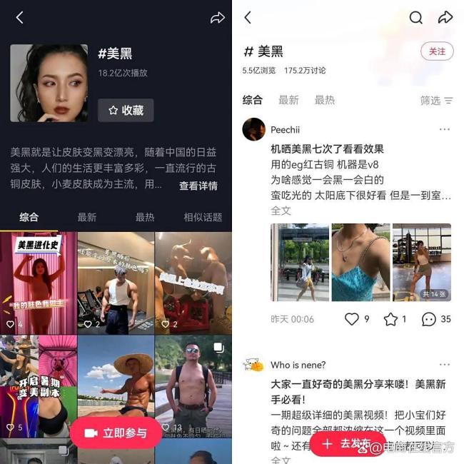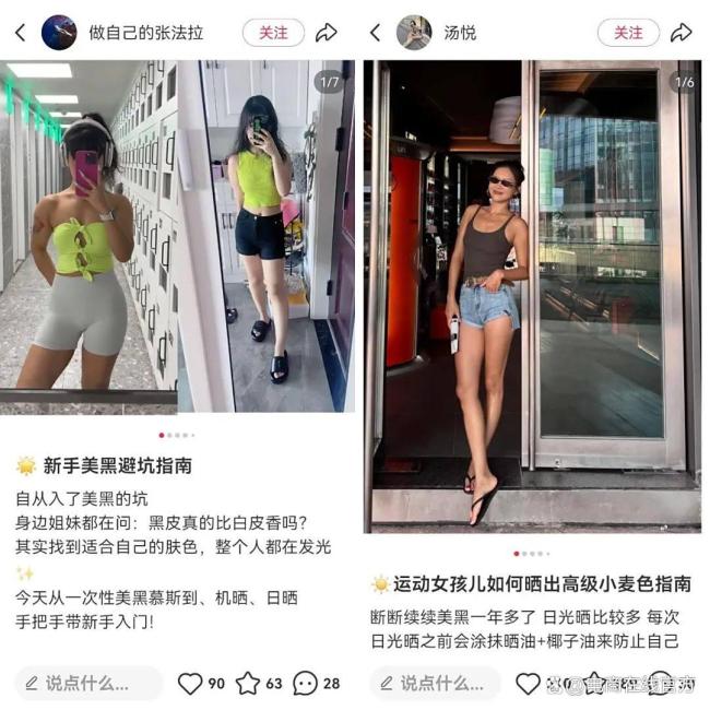 五六年前,美黑相关内容还很少见,但如今,伴随着观念变化,算法也将美黑攻略推入千万级流量池。小红书上,“美黑”笔记超过19万条,话题浏览量达到5.5亿次,抖音上的“美黑”播放量更是达到了18.2亿次。