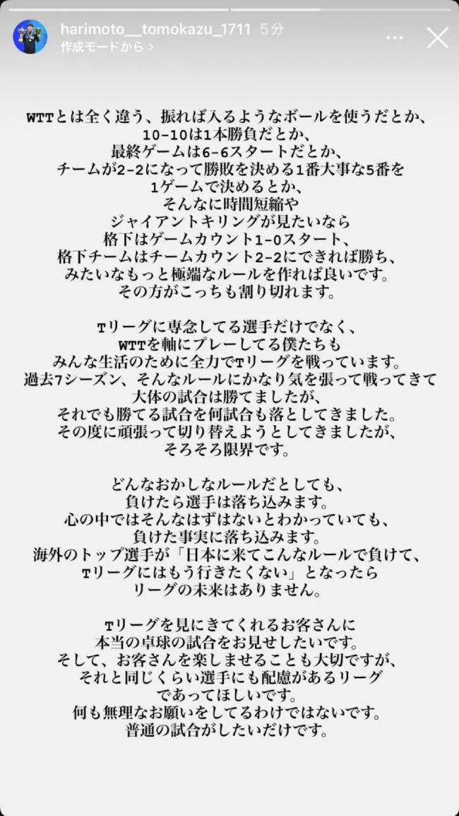 张本智和在社交媒体上表达了对日本T联赛规则的不满。他认为,如果目标是打造世界顶级联赛,就不应该制定不利于顶尖选手的规则。他指出,T联赛的规则正在摧毁运动员们的斗志。