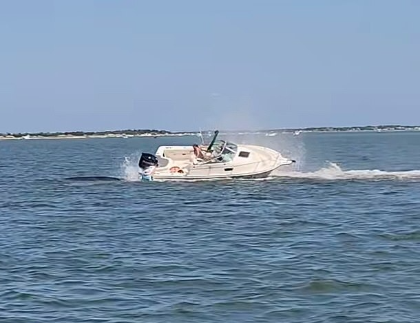 视频中可以看到鲸鱼就在船旁边。当它试图绕过船头时,使船倾覆,导致一名穿着蓝色衬衫、戴着白色帽子的乘客掉入水中。居民金·曼奇尼记录下了这一事件,她喊道:“哦,我的天啊,他们要掉下去了!” 一名男子大声喊着关掉发动机。最终,落水的水手爬回船上,没有受伤。鲸鱼则缓慢游走,看起来受伤了。