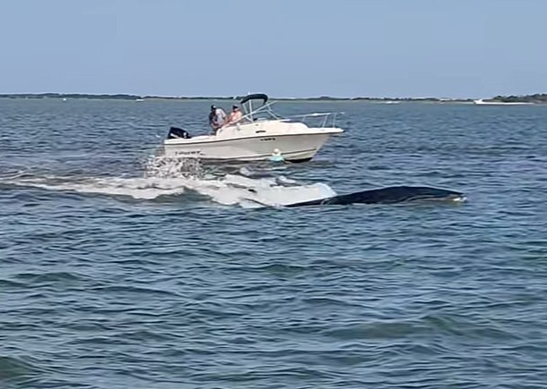 美一船只与鲸鱼相撞乘客被甩入水中!8月3日,周六下午2点45分左右,有人在巴尼加特湾发现了一头约6米长的小须鲸。新泽西州警察局海事部门随后通知了海洋哺乳动物搁浅中心的相关人员。不到一小时后,一名船员报告称他们的船撞上了这头鲸鱼,导致船只几乎倾覆,一名水手落水。录像显示,船在水中剧烈摇晃,鲸鱼在水中挣扎,似乎被船卡住。
