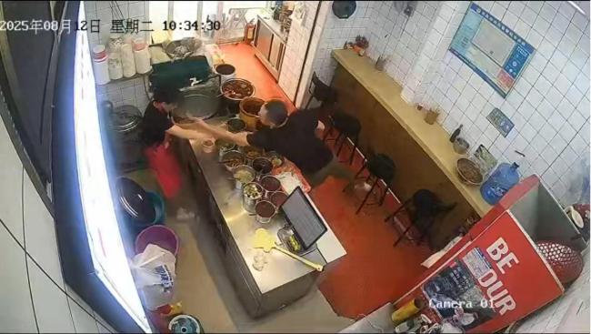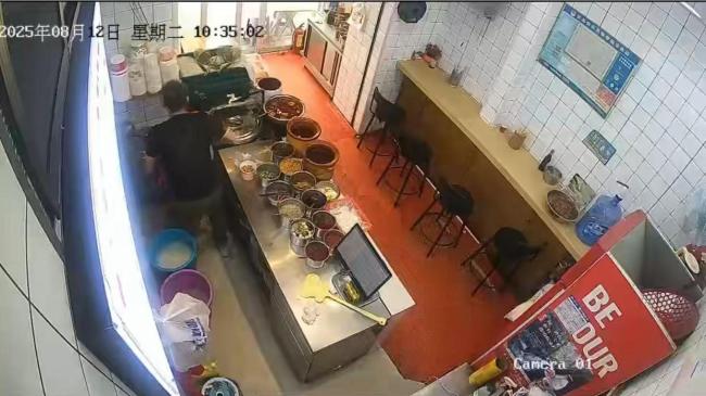 监控视频显示,这名男子先进入店内,随后女店员端着一个铁盆进入。男子似乎让女店员先走,女店员迟疑了一下后快步走向收银台,而男子则试图跟上她。在收银台,男子支付了9元钱,女店员在一旁的操作台制作餐点。男子对女店员说话,但女店员没有回应。当女店员为他打包餐点时,男子靠近操作台,女店员抬脚试图制止,但男子继续上前。女店员大喊“不要”,并背对男子蜷缩身体,男子疑似对她进行了不当行为。女店员挣扎约10秒后,男子离开操作台,但仍与女店员交谈。最终,在37分左右,男子离开了店铺。
