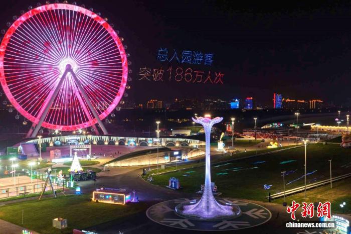 8月31日晚,第二十三届哈尔滨国际啤酒节在哈尔滨冰雪大世界园区闭幕,无人机编队在夜空打出喜报:总入园游客突破186万人次。 哈尔滨冰雪大世界供图