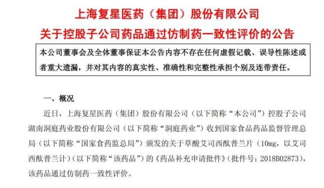 截至目前,国内市场上销售的草酸艾司西酞普兰有片剂、口服溶液两种。在片剂方面,2008年,山东京卫制药的草酸艾司西酞普兰片首仿上市,并在2018年通过仿制药质量和疗效一致性评价。同年,科伦药业和复星医药旗下湖南洞庭药业的草酸艾司西酞普兰片也相继通过仿制药一致性评价,成为首批与灵北制药展开角逐的本土药企。