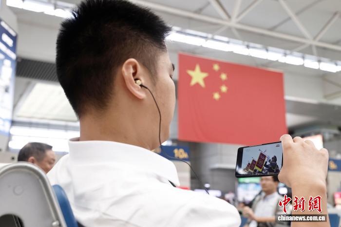 图为在铁路上海虹桥站候车大厅,旅客用手机观看视频直播。中新社记者 殷立勤 摄