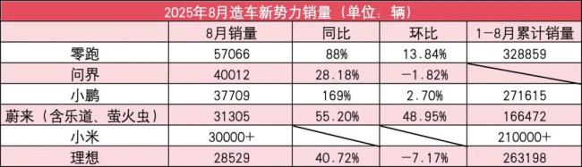 淡季不淡,多家新势力在8月交付量狂飙,像零跑、小鹏、蔚来等还创造了新的销量纪录。从排名来看,零跑和问界稳居第一;小鹏、蔚来公司、小米三家交付量均破3万。不过由于小米未公布具体交付数据,无法对这三家进行排名。对比之下,理想销量表现则较为惨淡,其交付量再次下滑,少有的跌下了3万辆,排在头部新势力的末端。