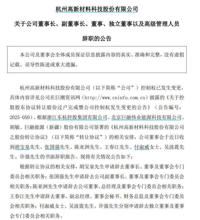 杭州高新7名高管集体辞职 控制权变更引发人事地震!9月4日晚间,杭州高新发布公告称公司董事长、副董事长、董事、独立董事以及高级管理人员共7人辞职。胡宝泉辞去董事长及相关职务,张国强辞去副董事长及相关职务,陈亚洲辞去董事及总经理职务,王春江辞去董事、副总经理、董事会秘书、财务总监等职务,付淑威、吴波震、许强分别辞去独立董事及相关职务。
