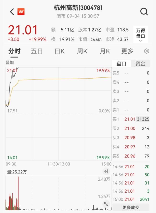 9月4日,杭州高新股价逆市大涨,开盘不久即封住20cm涨停,收盘价为21.01元/股,涨幅达19.99%。