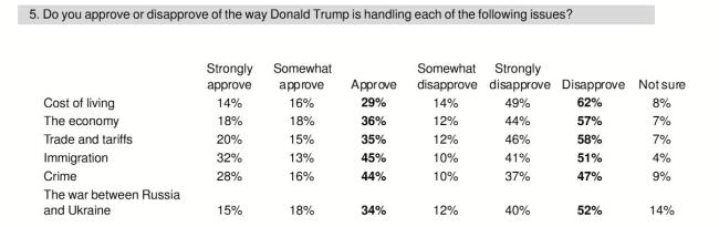 本周的情况进一步体现了这一现象。雅虎新闻/YouGov进行的一项新调查显示,特朗普在“生活成本”问题上的支持率已经降至29%,不支持率高达62%,这是他在所有主要议题中支持率最低的。近六成美国人认为,美国正走在错误的道路上。