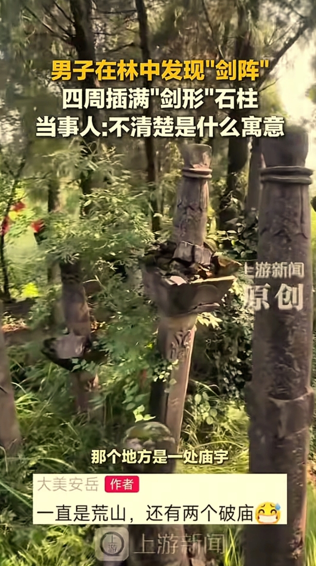 四川一男子在林中发现“剑阵”。“万万没想到!”四川资阳,男子去山上游玩,本以为是一片荒山,不料,他竟然直接愣在了原地,不是因为发现了宝贝,而是被眼前成片的“石头剑阵”吸引住了,男子傻眼了,看了半天也不愿意离开。以前看过的武侠剧和小说,男主受伤躲进荒山里,突然发现不为人知的石头阵,是不是就属于这种?有网友兴奋道:是不是剑派宗门被你发现了?起初男子以为这山上只有两座旧庙,直到往里面走眼前突然出现一片片高大的石头剑阵群,堪称鬼斧神工。男子简直不敢相信自己的眼睛,可事实就摆在眼前,他以前也来过这座山,怎么就没发现呢?视频中,这些石头剑,剑柄朝上,虽然高矮不一,但是剑尖都深埋在地下,剑身上还刻着复杂的花纹,足足有上百个,仿佛时刻在等待召唤,拔地而起。这形状显然是人为制作的,一眼看上去,年头久远,至于什么时候出现的,男子也说不清。但他觉得这次没白来,能发现这样的奇观太值了!有网友说:剑仙传承有缘人,兄弟上前挑一把摸摸看!这地方确实神奇,大家猜猜,这些石头剑到底是怎么形成的?你觉得是应该把这些老物件保护起来,还是开发旅游,拍照打卡呢?