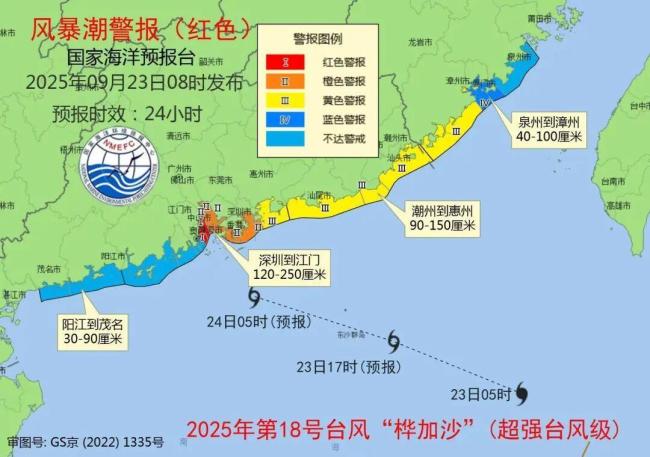受超强台风“桦加沙”影响,国家海洋预报台今天早上将风暴潮、海浪预警级别双双升级为红色。风暴潮方面,预计今天上午至明天上午,广东潮州到惠州沿海将出现90到150厘米的风暴增水,广东深圳到江门沿海将出现120到250厘米的风暴增水。广东省中山市、珠海市、深圳市、东莞市等地明天中午沿海低洼地区的海水倒灌风险较高。海浪方面,预计南海北部将出现8到13米的狂浪到狂涛区,台湾海峡南部、巴士海峡将出现4到6米的巨浪到狂浪区,广东近岸海域将出现4到7米的巨浪到狂浪。
