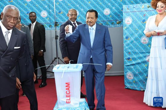 10月12日,在喀麦隆首都雅温得,喀麦隆总统、喀麦隆人民民主联盟候选人保罗·比亚在总统选举中投票。新华社发(科普索摄)