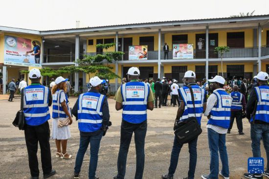 10月12日,在喀麦隆首都雅温得,国内外选举观察员在总统选举期间在投票站监督选举活动。新华社发(科普索摄)
