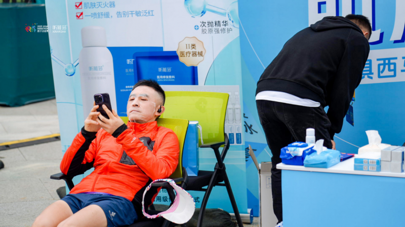 西安奥体中心的昕雅莎“肌肤急救站”,堪称赛后最具人气的聚集地。不同于传统的补给站点,这里以“沉浸式修护”“趣味互动”的模式,让参赛者和观众都能深度参与其中。在产品体验区,昕雅莎明星单品整齐陈列,专业护肤顾问一对一为参赛者分析雨中运动后的肌肤状态,手把手指导医用修复面膜、胶原棒的正确使用方法,不少参赛者敷上面膜后当场反馈:“跑完后脸又红又紧绷,敷上立马就舒缓了!”
