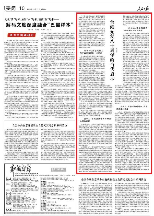 10月27日,《人民日报》刊发了中国社会科学院台湾研究所所长朱卫东的文章《台湾光复八十周年的当代启示》。文章谈到四点启示:坚定捍卫历史真相和国际一中格局;大力强化两岸命运共同体意识;坚决维护国家主权和领土完整;携手推进统一,共享民族复兴荣耀。文章强调,对历史最好的纪念是对现实最深的感悟,中国统一势不可挡。台湾前途在于国家统一,台湾同胞福祉系于民族复兴。