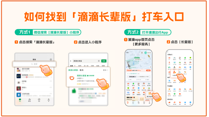在主管部门指导下,滴滴于2021年1月正式上线助老打车服务。在滴滴出行App或微信小程序主页点击“更多服务”找到即可体验。子女可协助家中长辈在微信搜索框输入“滴滴长辈版”进入小程序,帮助老人“更快上手”,满足“一键出行”的日常需求,让跨越代际的温暖在指尖持续传递。