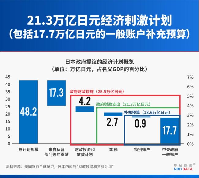 该计划的核心是2025财年补充预算一般会计支出高达17.7万亿日元,创下新冠疫情以来的新高。这项支出的主要目的是缓解民众的生活成本压力,包括能源成本补贴、育儿家庭补助以及税收减免等措施。如果算上私营部门相关支出,日本经济计划的总规模为42.8万亿日元。