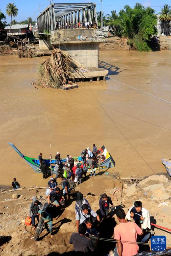 11月30日,在印度尼西亚亚齐省的美伦地区,人们在桥梁损毁后乘船过河。新华社发(尤哈姆摄)
