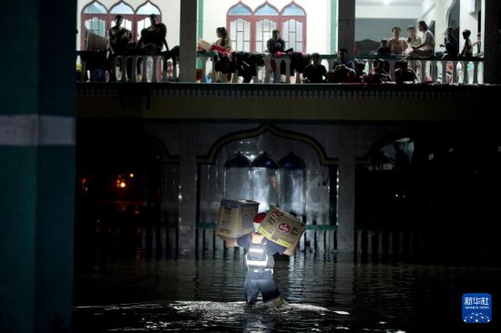 11月29日,在印度尼西亚北苏门答腊省的棉兰,救援人员涉水运送物资。新华社发(萨达姆摄)