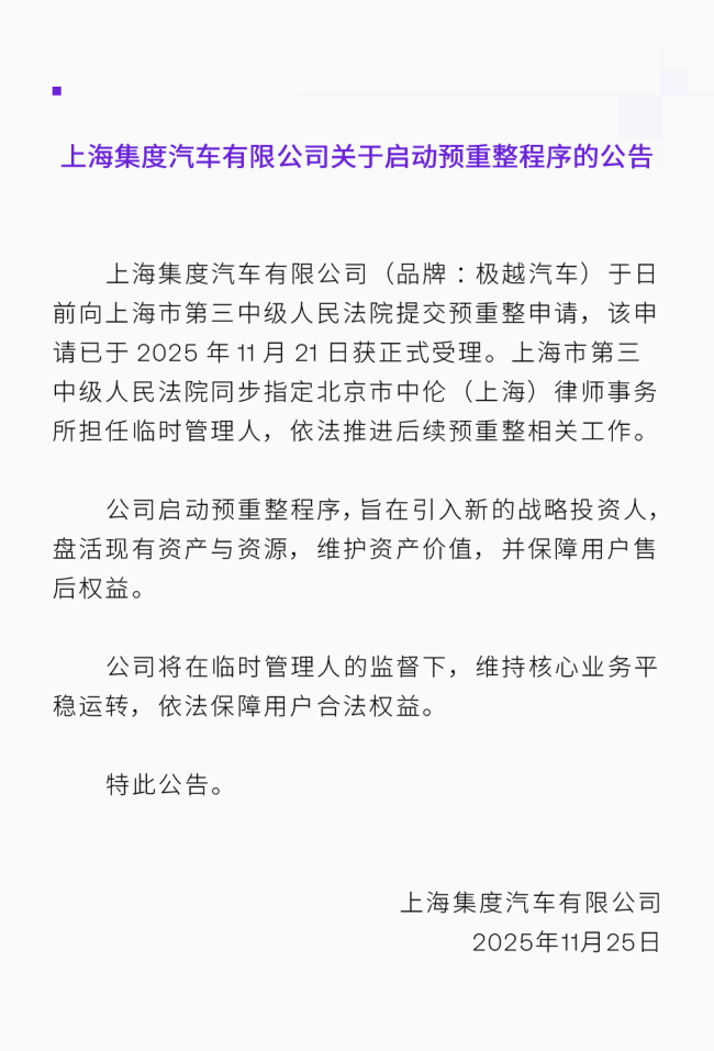 而在此前的11月25日,集度曾发布启动预重整程序的公告。集度在公告中称,公司日前已经向上海市第三中级人民法院提交预重整申请,该申请已于2025年11月21日获正式受理。上海市第三中级人民法院同步指定北京市中伦(上海)律师事务所担任临时管理人,依法推进后续预重整相关工作。集度称,公司启动预重整程序,旨在引入新的战略投资人:盘活现有资产与资源,维护资产价值,并保障用户售后权益。同时,公司将在临时管理人的监督下,维持核心业务平稳运转,依法保障用户合法权益。