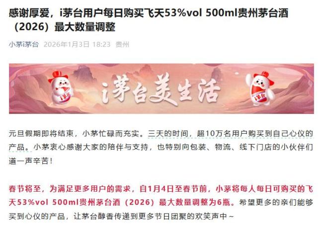 飞天每人每日限购减半至6瓶!i茅台 春节前调整购买限额!1月3日晚间,贵州茅台通过“小茅i茅台”宣布,为满足更多用户的需求,自1月4日至春节前,每人每日可购买的飞天53%vol 500ml贵州茅台酒(2026)的最大数量调整为6瓶。元旦假期三天内,超过10万名用户成功购买到心仪的产品。