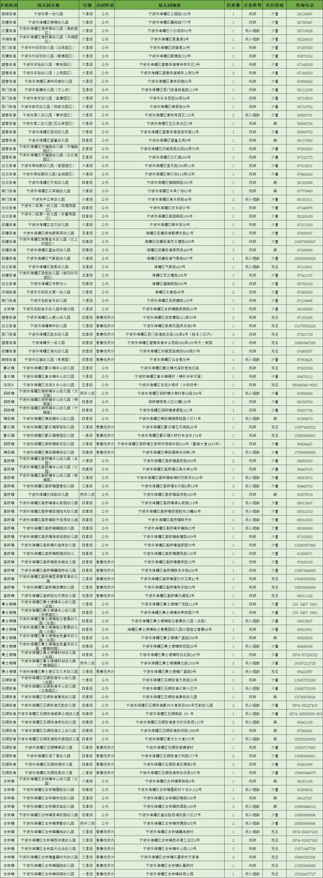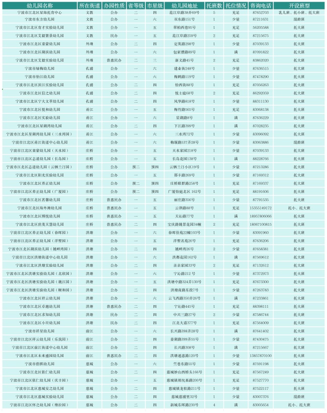不少家长正在为孩子的入托问题发愁,想知道家附近有哪些幼儿园以及是否还有名额。近日,江北区和海曙区公布了2026年春季幼儿园普惠性托位信息情况。家长们可以拨打幼儿园电话进行咨询报名。