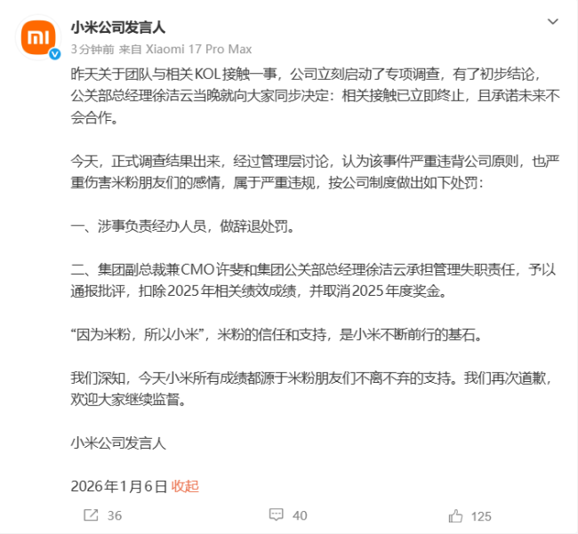 今天,正式调查结果公布,管理层讨论后认为该事件严重违背公司原则,也严重伤害了米粉的感情,属于严重违规。因此,公司做出以下处罚:涉事负责经办人员被辞退;集团副总裁兼CMO许斐和公关部总经理徐洁云因管理失职被通报批评,扣除2025年相关绩效成绩,并取消2025年度奖金。