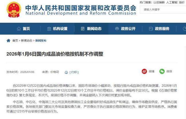 国内成品油价2026年首轮搁浅!据国家发改委网站消息,自2025年12月22日国内成品油价格调整以来,国际市场油价小幅波动。按现行国内成品油价格机制测算,2026年1月6日的前10个工作日平均价格与2025年12月22日前10个工作日平均价格相比,调价金额每吨不足50元。根据《石油价格管理办法》第七条规定,本次汽、柴油价格不作调整,未调金额纳入下次调价时累加或冲抵。