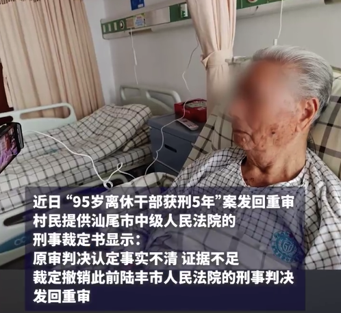 近日,“95岁离休干部获刑5年”案发回重审。广东汕尾市中级人民法院的刑事裁定书显示,原审判决认定事实不清,证据不足,裁定撤销此前陆丰市人民法院的刑事判决,发回重审。