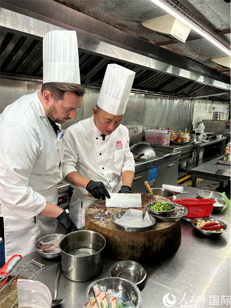 广东汕头,人民网外专柯明可与陈志毅师傅(左一)在潮舫英歌宴餐厅品尝他们制作的菜肴。人民网记者 刘宁摄