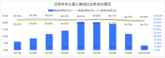 自成立以来,火星人长期依赖集成灶核心产品,该品类营收和利润占整体比重长期在85%以上。虽然推出了少量集成水槽、洗碗机等产品,但未能形成完善的产品矩阵,产品同质化严重,在集成灶之外,缺乏具有核心竞争力的爆款产品。