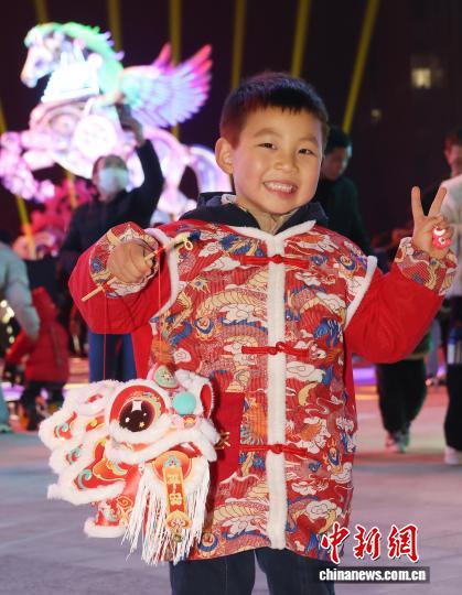 3月3日晚,江苏南京,小朋友拿着彩灯在飞马彩灯前留影。中新社记者 泱波 摄
