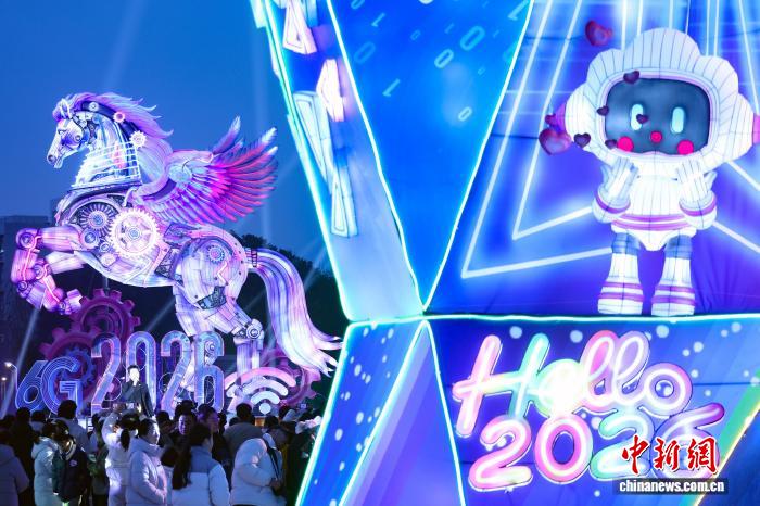 3月3日晚,江苏南京,市民在充满科技感的飞马彩灯前参与互动游戏。中新社记者 泱波 摄