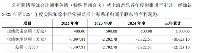 然而,2022年至2024年,上海悉乐的实际经营持续亏损,三年累计扣非净利润为-1.06亿元,与签订的业绩承诺协议差1.21亿元。