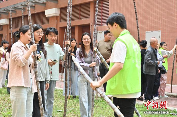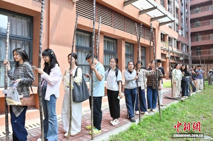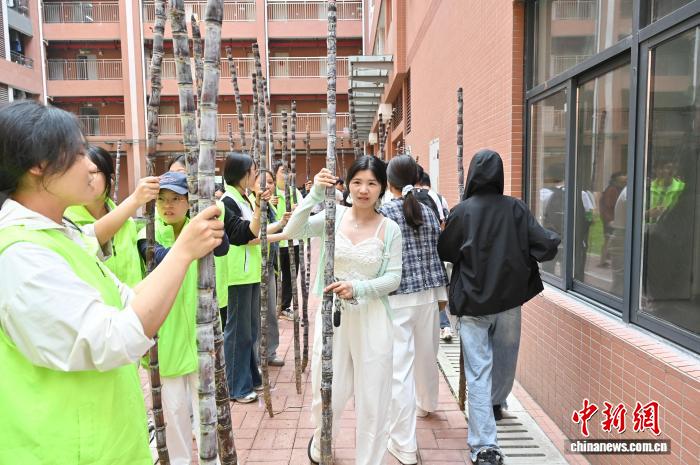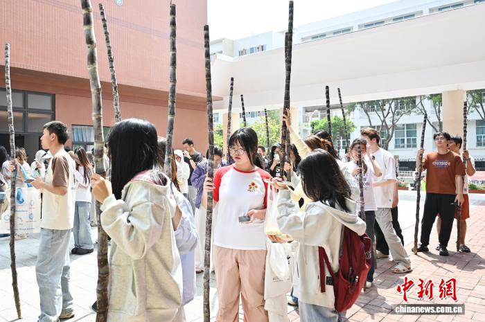 3月19日,学生在位于广州市天河区的华南农业大学领取免费的南沙黑皮果蔗。据了解,本次该校发放的爱心甘蔗共100吨,以助农惠农为初心,由南沙农业农村局捐赠。中新社记者 陈楚红 摄