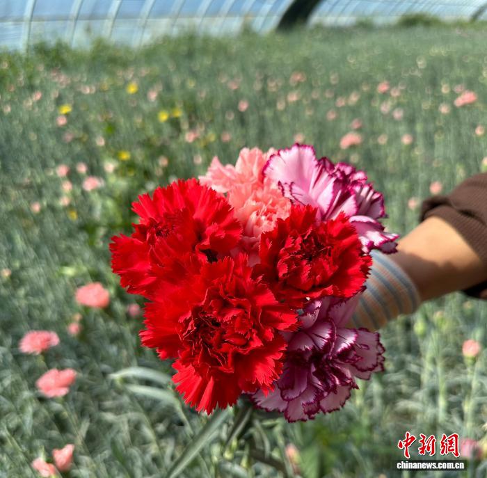 中新网兰州4月8日电 (丁思 田鹏鹤)清明小长假期间,鲜花消费需求持续攀升,订购量大幅增加。在甘肃武威市凉州区清水镇“深花巷子”鲜切花产业园内,一束束康乃馨含苞待放、缀满枝头,村民们有条不紊地忙着采摘、分拣、包装,花店经营者则直接进驻园区“抢单”。