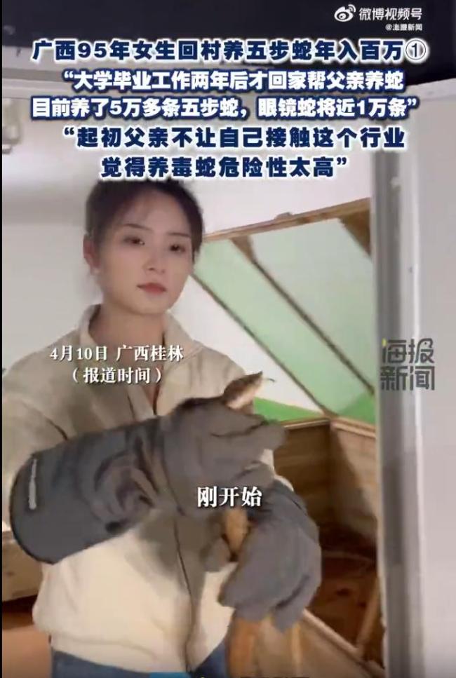 4月10日,广西桂林一位1995年出生的秦女士在大学毕业两年后回到家乡,帮助父亲养蛇。她现在养殖了5万多条五步蛇和将近1万条眼镜蛇,每年收入达到百万。起初,她的父亲并不希望她接触这个行业,认为养毒蛇非常危险。但随着业务的发展,父亲忙不过来,秦女士便决定回来帮忙。她表示自己并不怕蛇,因为在她出生之前,家里就已经开始养蛇了。