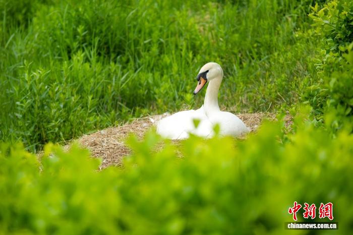 4月16日,河南郑州,随着气温回升,当地疣鼻天鹅进入孵化期。图为郑州金水河区域,疣鼻天鹅在巢中孵蛋。中新社记者 范晓恒 摄