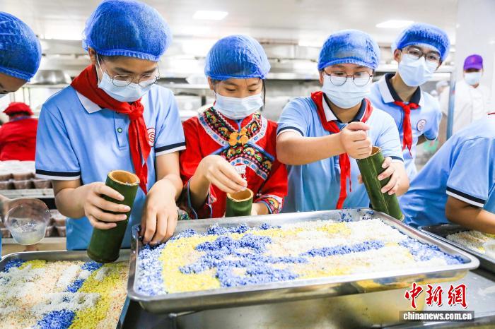 广西苍梧百余名学生同制五色糯米饭迎接“三月三”