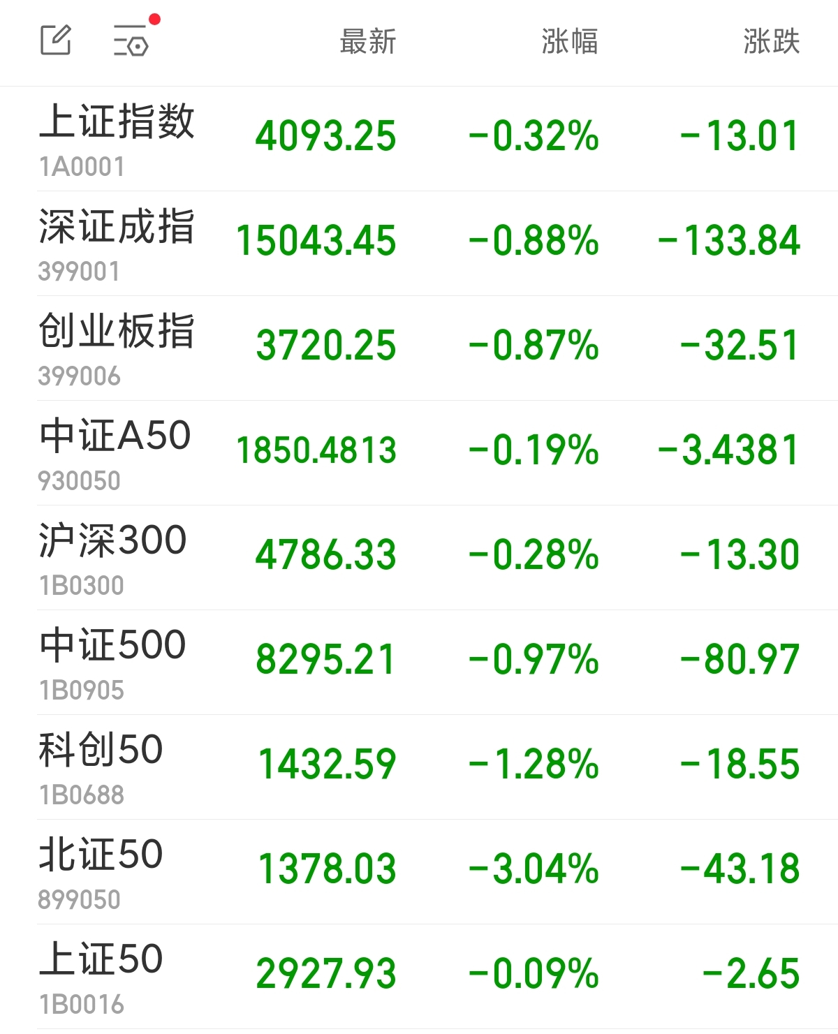 中新经纬4月23日电 周四,A股三大指数集体下跌,创业板指盘中跌近2%,此后跌幅收窄。截至收盘,上证指数跌0.32%,报4093.25点;深证成指跌0.88%,报15043.45点;创业板指跌0.87%,报3720.25点。