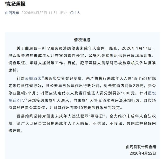 官方通报KTV服务员被指性侵 嫌疑人已被批捕。河北曲周县联合调查组4月22日发布情况通报,关于一KTV服务员涉嫌侵害未成年人案件,经调查,2026年1月17日,有群众报警称其未成年女儿在宾馆遭性侵害。公安机关接警后迅速开展现场勘查、调查取证和嫌疑人抓捕等工作。目前,犯罪嫌疑人黄某轩已被检察机关依法批准逮捕。
