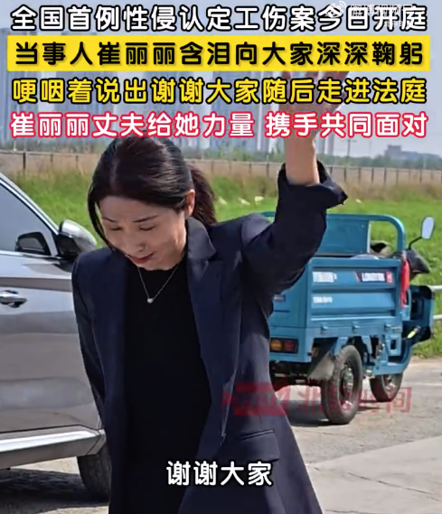 4月23日,天津。全国首例性侵认定工伤案今日开庭 ,当事人崔丽丽含泪向大家深深鞠躬。哽咽着说出谢谢大家随后走进法庭,法庭外的记者喊出“加油”为她加油打气。