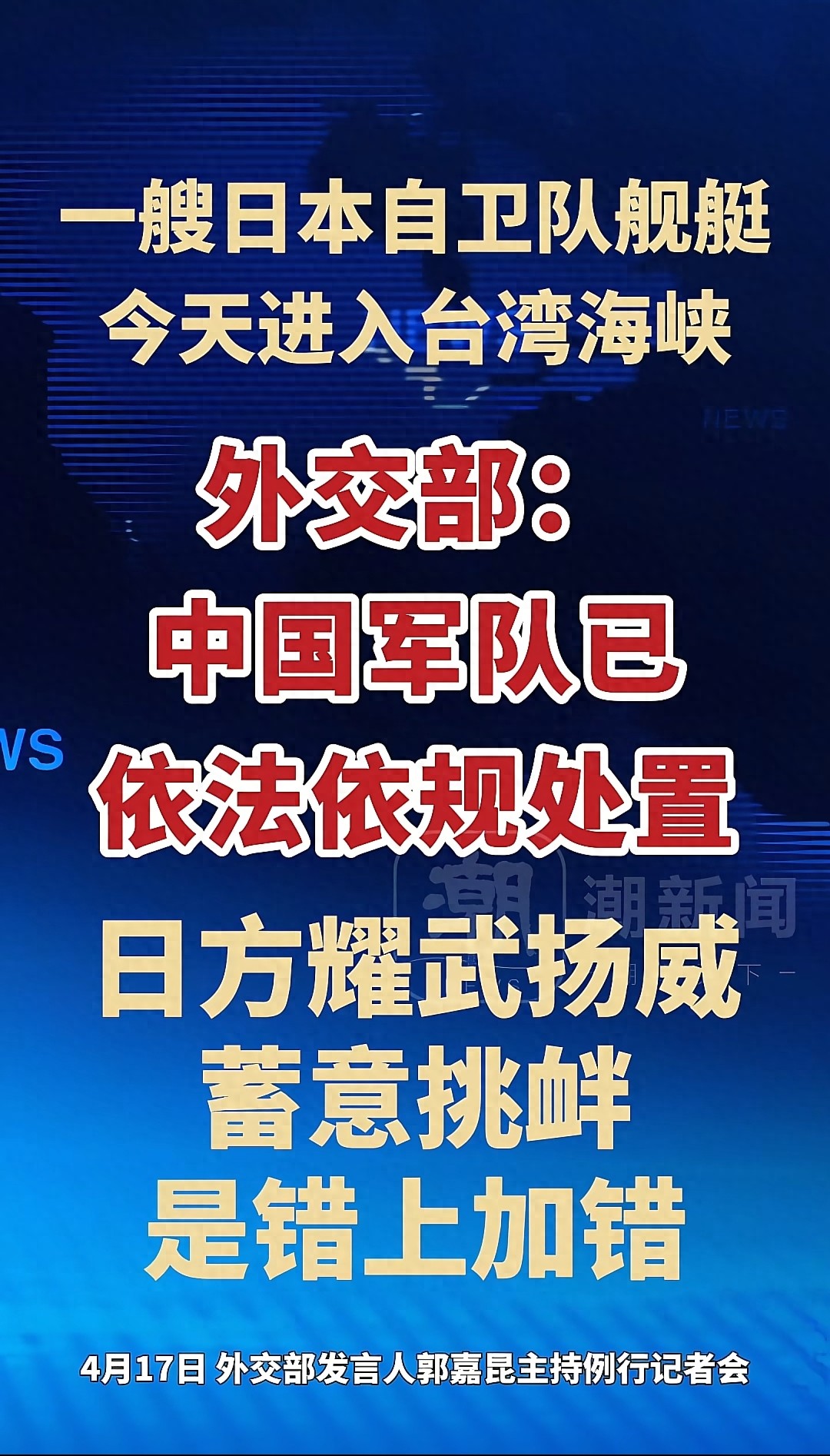 2026年4月17日,北京,外交部例行记者会上,一则消息迅速引爆全网:一艘日本自卫队舰艇进入台湾海峡活动,中国军队已依法依规处置。外交部发言人郭嘉昆当场表态,日方此举是耀武扬威、蓄意挑衅,错上加错,态度之强硬、措辞之严厉,罕见且有力。