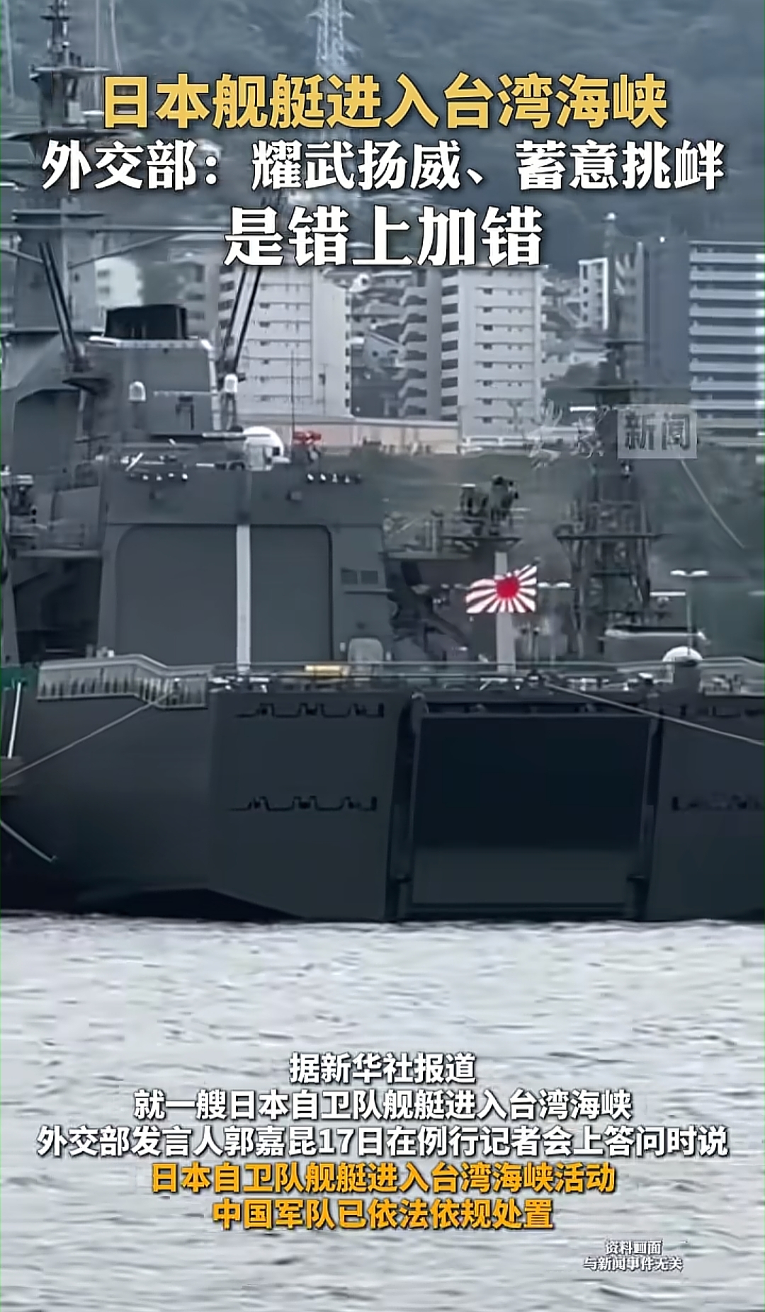 首先,不是简单“路过”,是蓄意挑衅。外交部把这次行动和日本首相高市早苗的涉台错误言论直接挂钩,指出这已经给中日关系带来严重冲击。这就不是孤立事件了,而是日方错误政治导向的延续,暴露了其企图武力介入台海、破坏稳定的危险图谋。