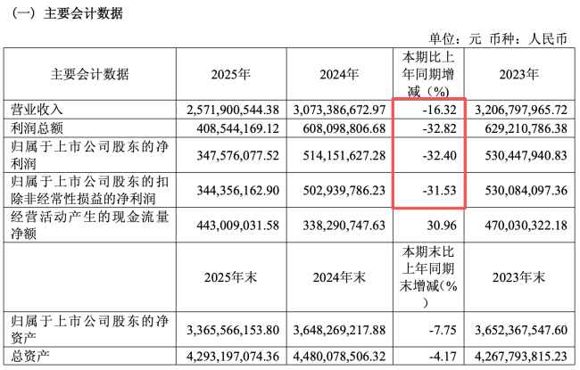 根据千禾味业最新披露的年度报告显示,2025年,公司实现营收约25.72亿元,同比下滑16.32%;实现归属净利润约3.48亿元,同比下滑32.4%;实现扣非净利润约3.44亿元,同比下滑31.53%。